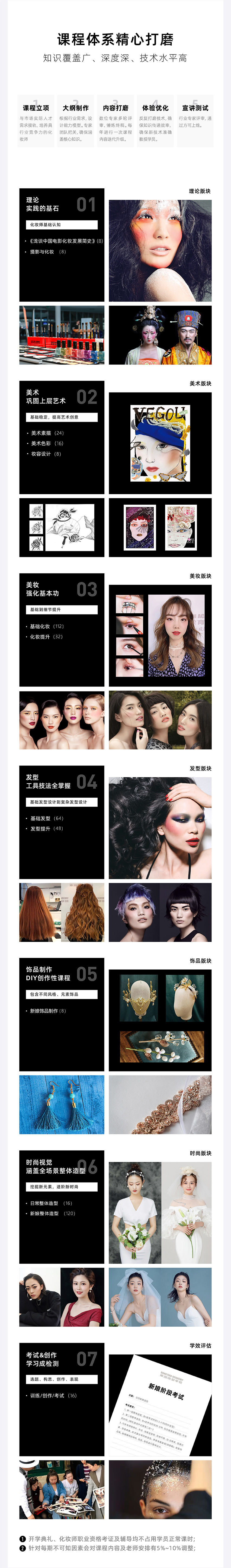 新郎&伴娘&妈妈妆造 婚礼日新娘全流程 影楼工作全流程 旅拍摄影工作全流程 日系鲜花造型 韩系新娘造型 复古新娘造型 中式新娘造型——旗袍 中式新娘造型——秀禾(龙凤褂、马来袍) 中式新娘造型——汉服 中式新娘造型——新中式新娘造型 民族婚礼造型 高定新娘&婚纱秀场 时尚新娘造型流行趋势解析 新娘整体造型实战演练