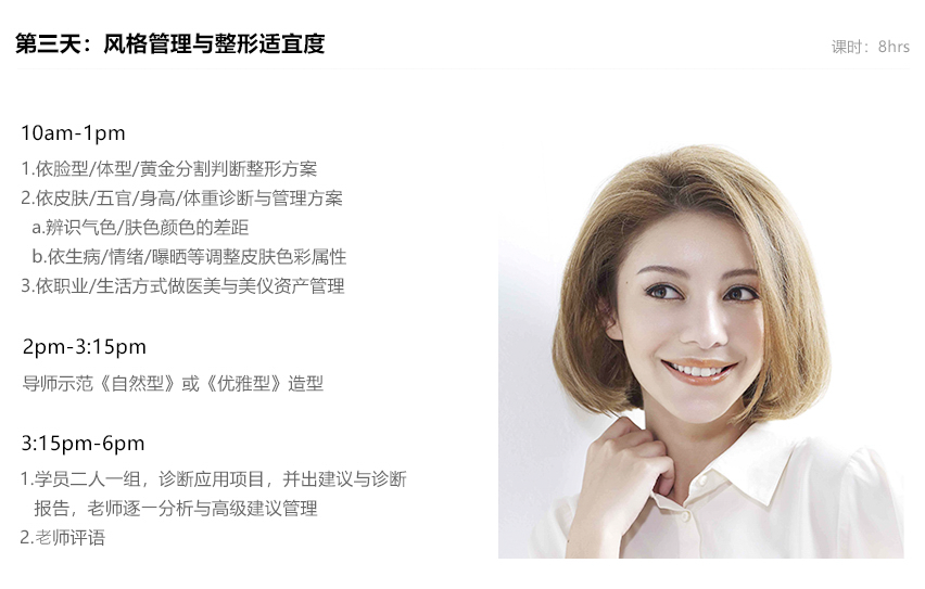 1.依脸型体型黄金分割判断整型适宜度 2.依个人皮肤、五官、身高与体重诊断与管理方案 a.辨识出起色微妙的差距 b.如何看到肤色中隐藏的色彩 c.如何视外在变化调整皮肤色彩属性 3.依职业与生活方式作医美生美与美仪资产管理 a.个人风格的各种层次 b.以物造气:掌握塑造风格的工具 c.如何透过观人,归纳其风格 4.学员二人一组,依上午时尚审美分析教程诊断应用项目,并出判断报告,老师逐一分析与高级建议管理 5.老师评语